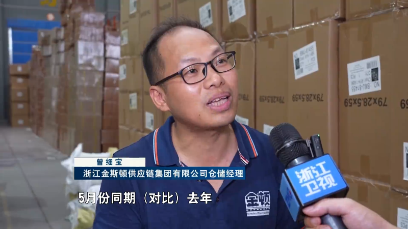 浙江金斯顿供应链集团有限公司仓储经理 曾细宝:5月份同期(对比)去年,大概42.5%的一个增长,就是发美国线。每天都是高负荷的运转。