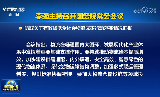 李强主持召开国务院常务会议,听取关于有效降低全社会物流成本行动落实情况汇报。(央视新闻)